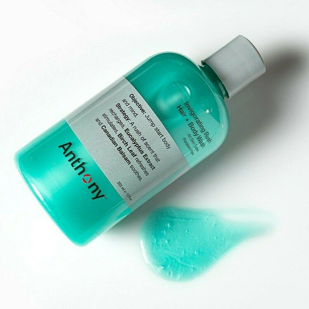 Anthony Mens Body Wash and Shampoo: Invigorating Rush 2-In-1 Liquid Gel Soap & Hair Shampoo, Pine Wood Scent, Hydrating with Eucalyptus, Canadian Balsam, Birch Leaf, Charcoal, Sea Kelp, 12 Fl. Oz