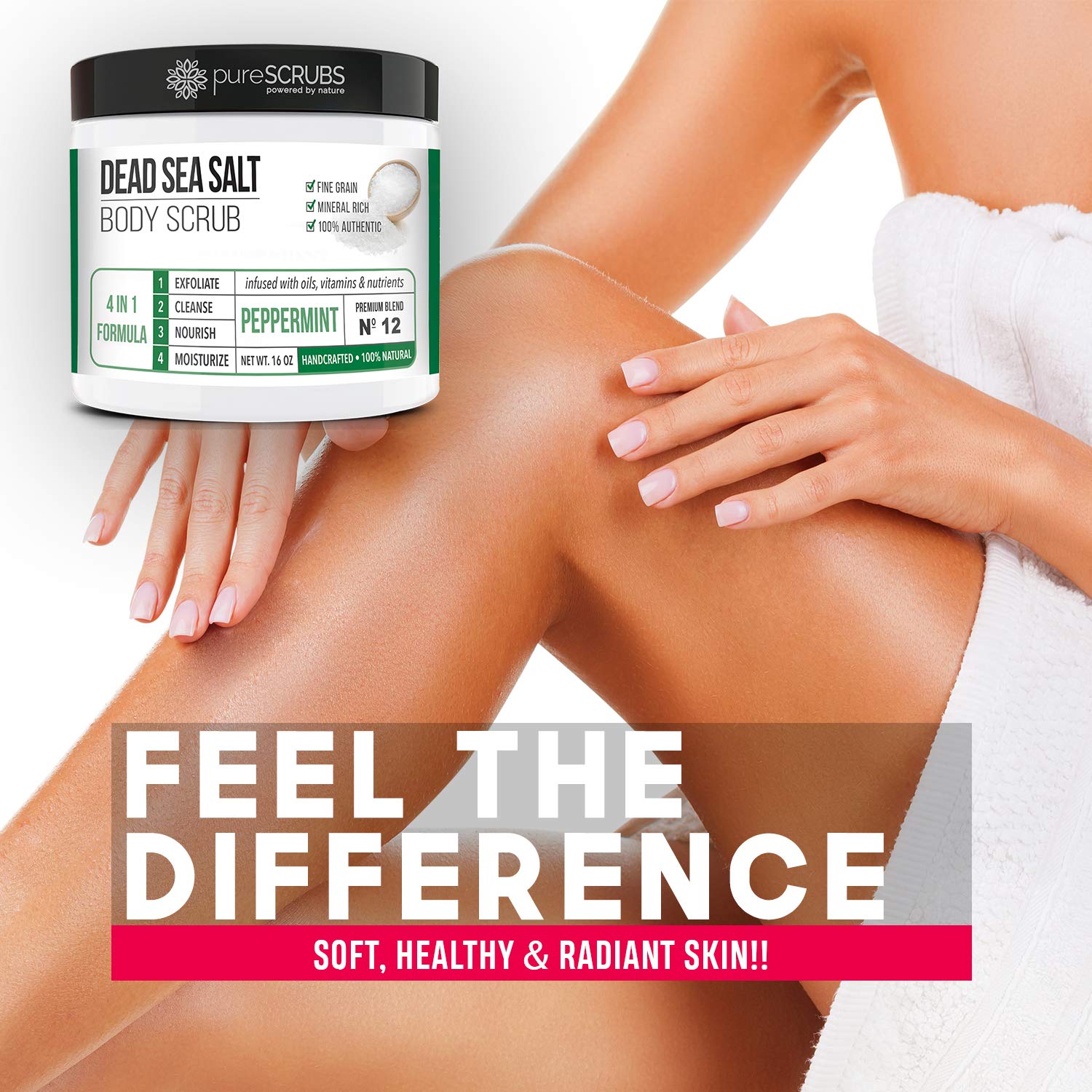 - GET ULTRA SMOOTH SKIN FAST - THIS WORKS! Our unique “4 in 1 Formula” does everything a body scrub should do and more - EXFOLIATE, CLEANSE, NOURISH & MOISTURIZE. Fine grain dead sea salt infused with essential oils, nutrients and skin softeners helps to smooth away rough, bumpy, and uneven textures to instantly reveal your true soft, healthy and radiant skin. You'll love the peppermint aroma!