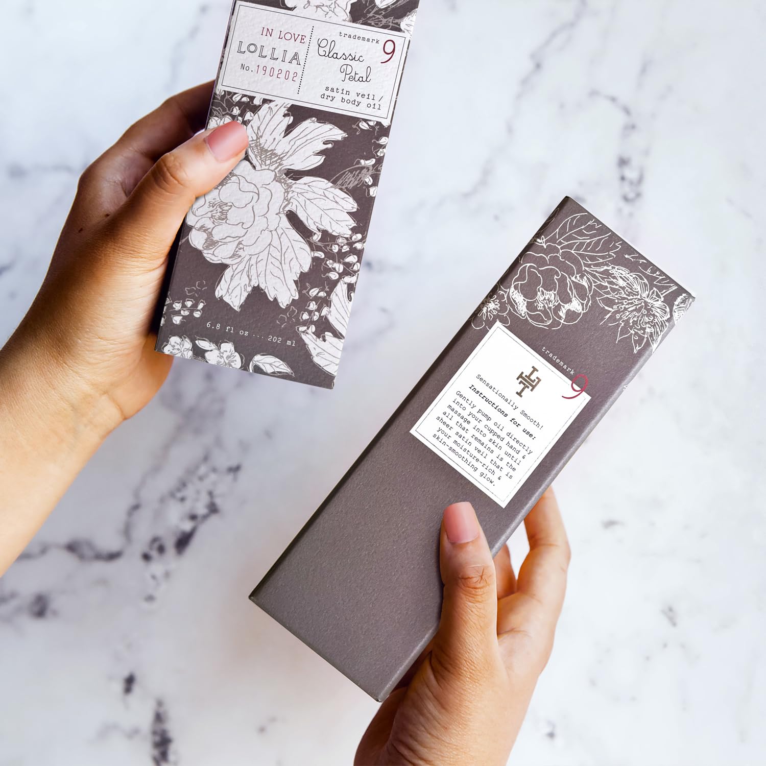 • ELEGANT GLASS BOTTLE: This dry oil for skin comes in a gold kissed glass bottle that nestles in a fine white rose patterned telescoping box of beautiful smoke and earthen slate.