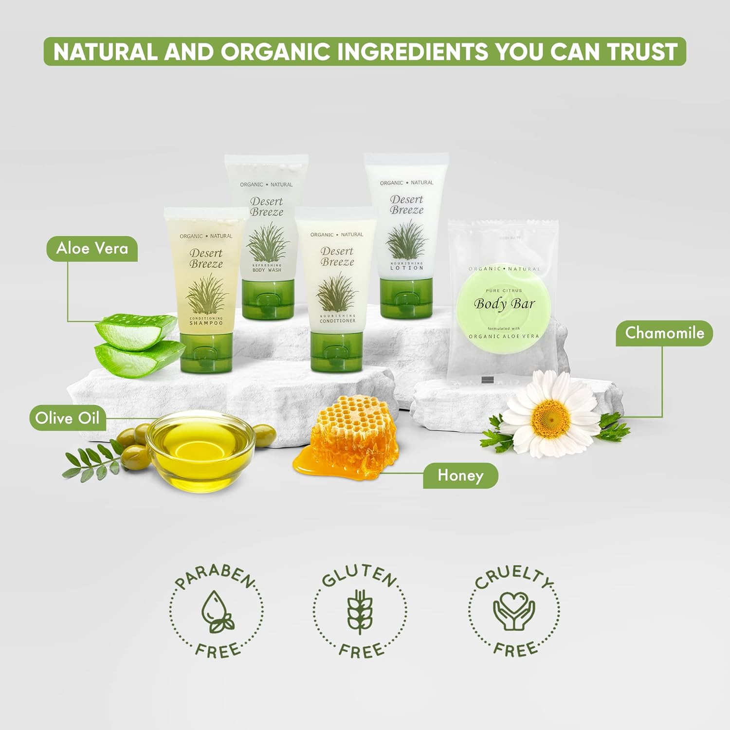 - WHY CHOOSE DESERT BREEZE? Our high-end formula & environmentally-friendly beautiful design bring elegance to any upscale property. These hotel toiletries are paraben-free, gluten-free & made with organic aloe, honey, & olive oil for soft skin & hair!