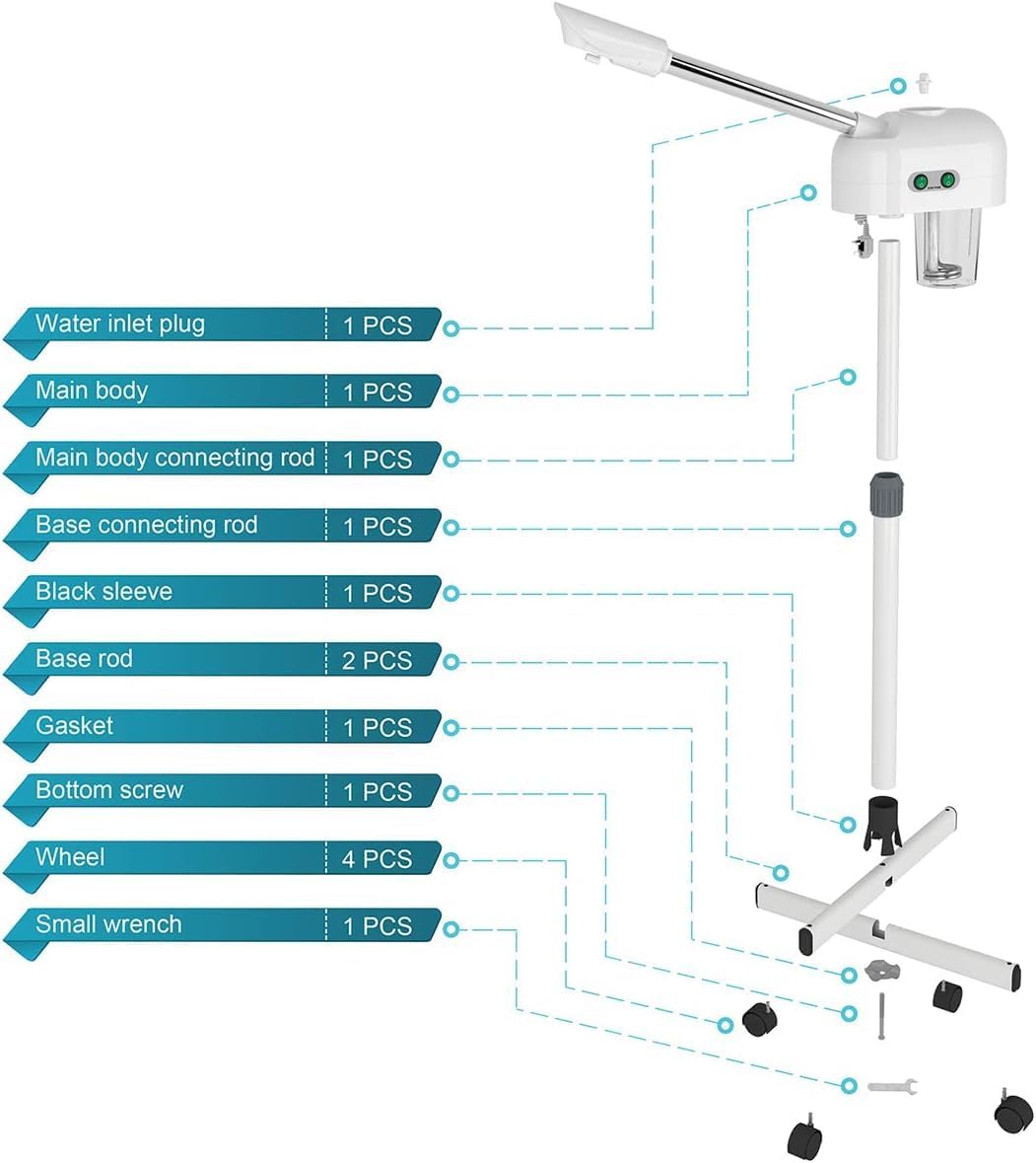 - ā EXQUISITE WORKMANSHIP : Titanium atomizing disc, more foggy, more fine, can extend spraying time. High quality SS pipe, sturdy and durable, no rust. Thicker high capacity water cup, can store 600ml water. The head of the machine is free to rotate 360°. Adjustable height from 38.1" - 46.4". Easy moving with universal wheels.