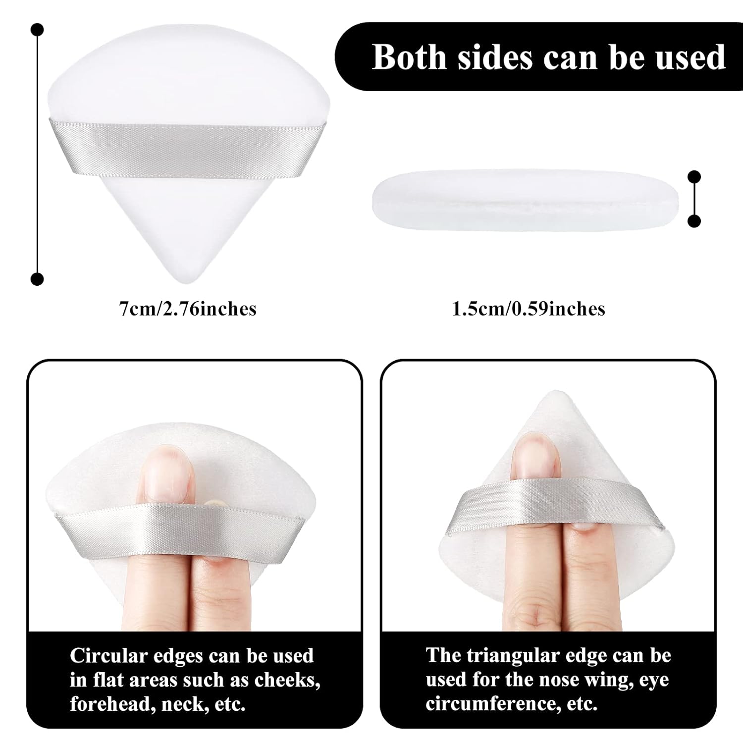 - Humanized style: our powder puff is actually designed with triangle and circle style, when you put the foundation on your cheeks and forehead, you can use the round side, when you put foundation on the eye, you can choose the triangle side, and you won't have to worry about the uneven makeup