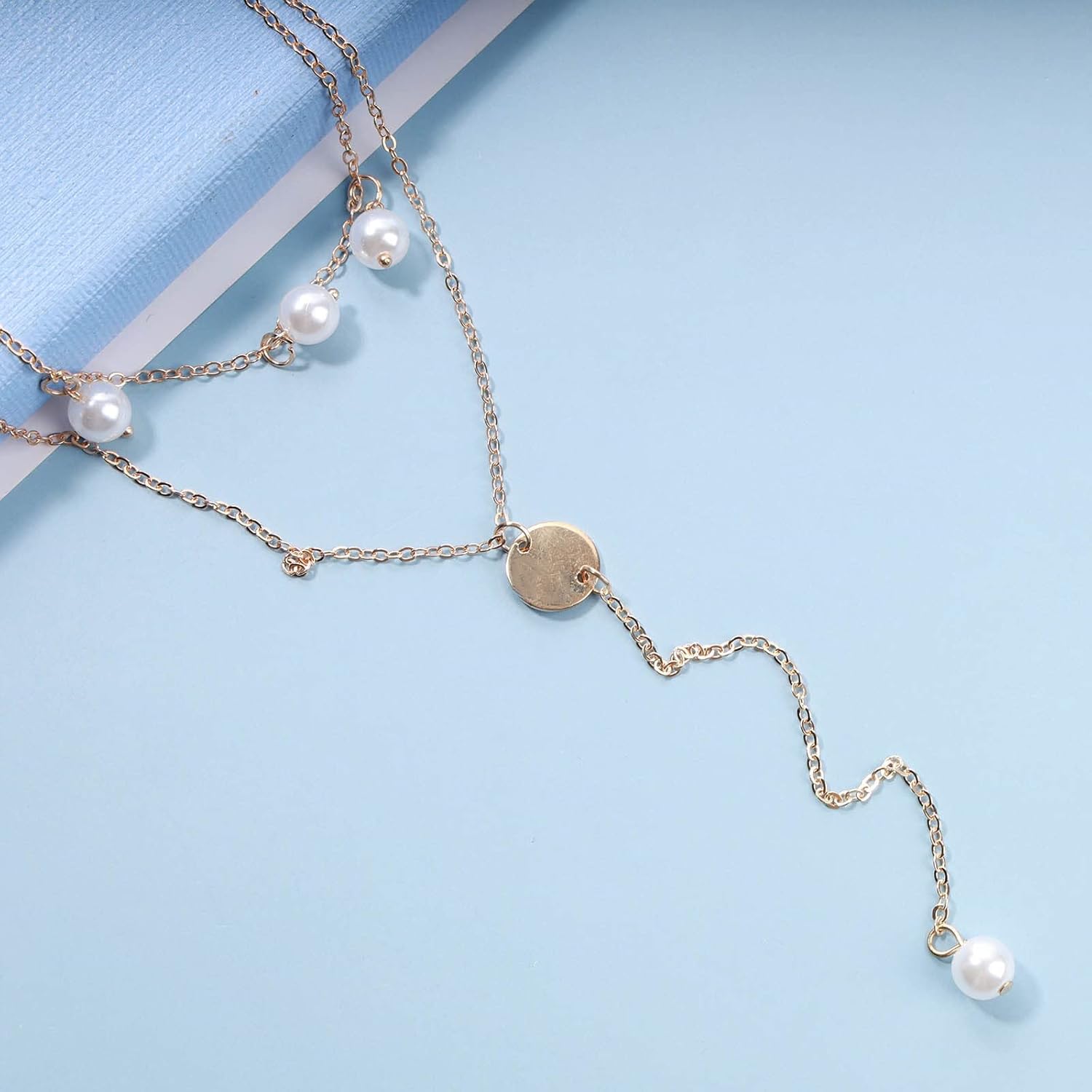 Boho Layered Disc Pearl Necklace Gold Coin Pendant Necklace Long Y Lariat Necklace Chain Vintage Pearl Dangle Chain Necklace Jewelry for Women and Girls Gifts