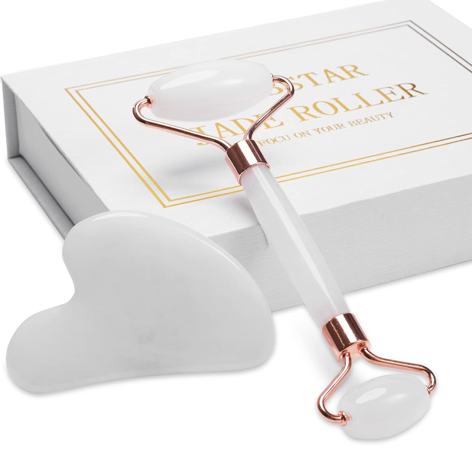 Jade Roller for Face, Facial Roller Massager Skin Care Tool, Gua Sha Facial Tools for Face, Neck, Eyes, Reduce Puffiness of The Skin - White