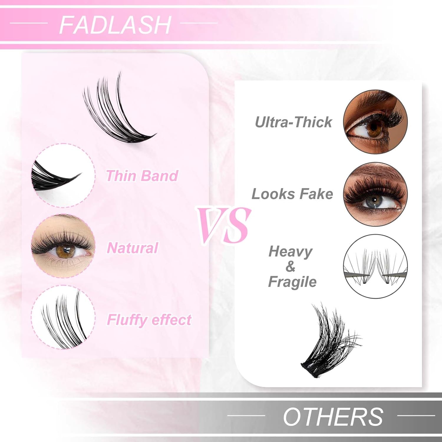 - New Lash Clusters: The lash clusters are made of high quality material. We have different styles you can create a glam cat eye effect or blend it with other styles for a natural daily look.