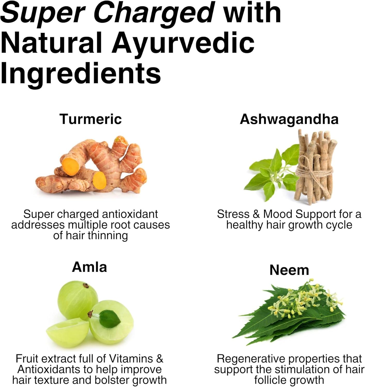 - š šØš« š©ššØš©š„š š°š¢šš” š¢š§šš«ššš¬šš š¬š”šššš¢š§š šš§š šššš«ššš¬šš š”šš¢š« ššš§š¬š¢šš². Hair Vitamins like Folate which aids in nutrient absorption and helps in the production of keratin, a protein that makes up the structure of hair. Ayurvedic ingredients like Ashwagandha Root, Turmeric, Amla fruit powder help increase hair growth, density and strength.