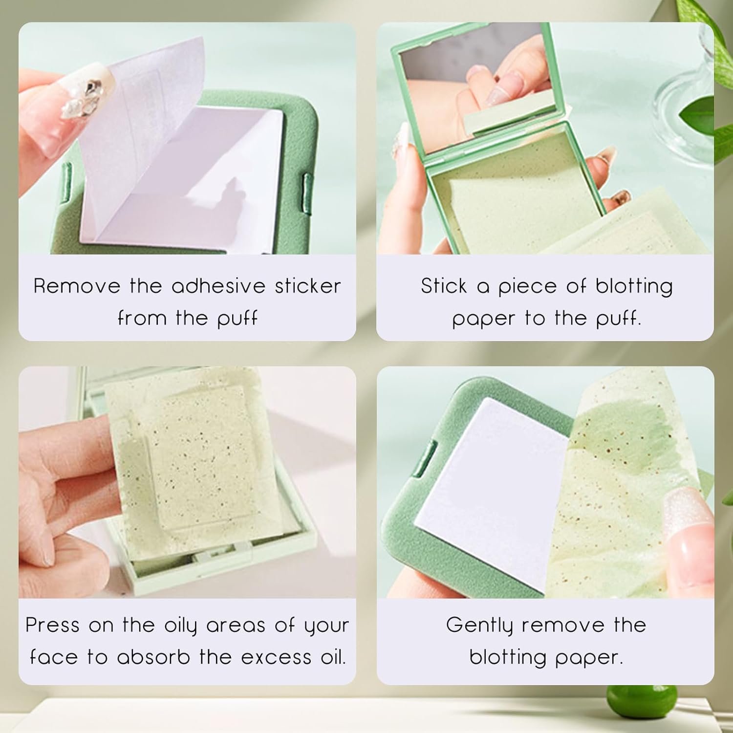 - How to Use: Tear off the adhesive sticker on the puff, then stick the oil blotter paper, gently press on the oily parts of the face to absorb the excess oil on the face, gently tear off the blotting paper after absorbing the oil, and throw it into the bin.