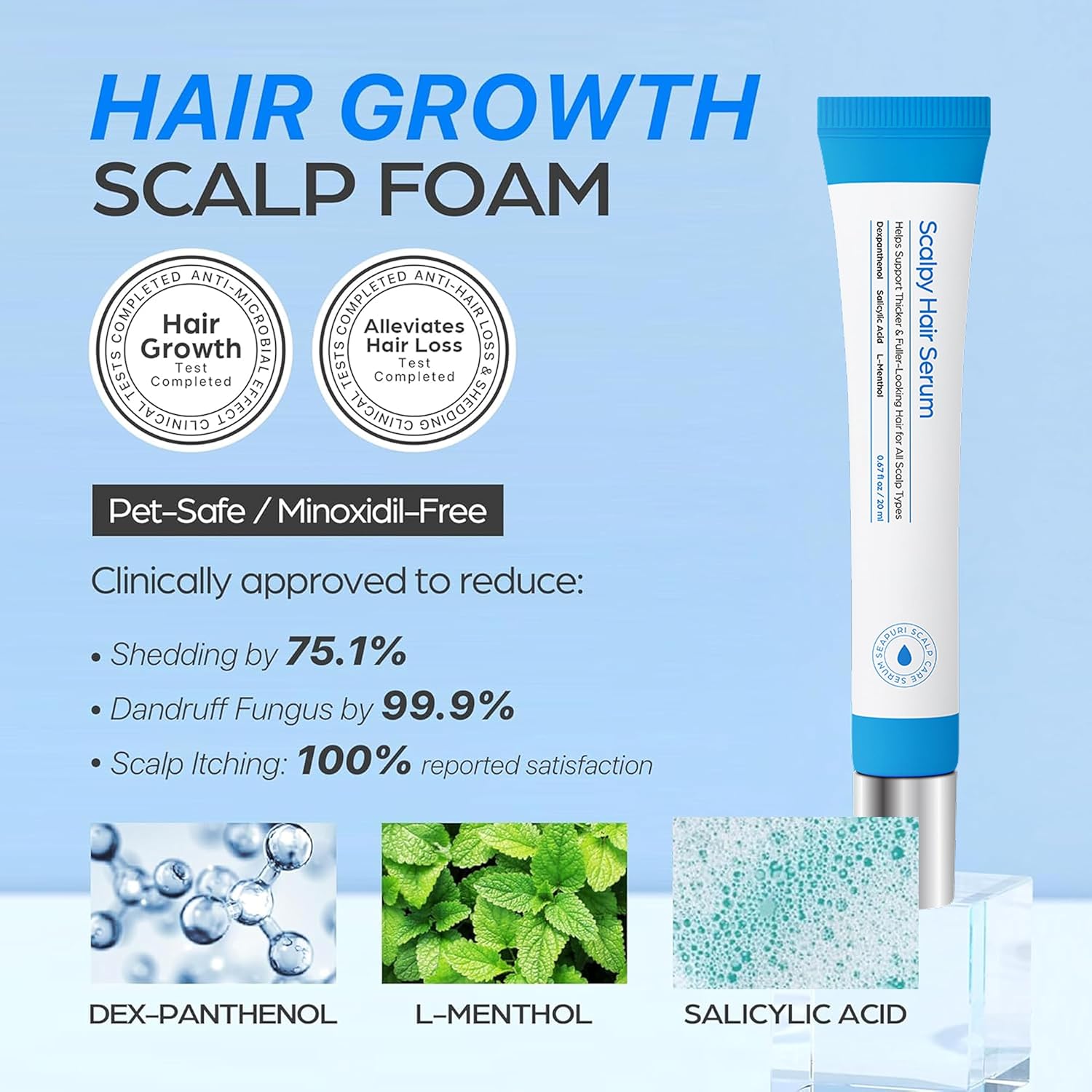 - PET-SAFE, MINOXIDIL-FREE FORMULA WITH PROVEN INGREDIENTS – Salicylic Acid, Dex-Panthenol, and L-Menthol along with mineral-rich Glacier Water strengthen roots and accelerate hair growth. No parabens, silicones, or harsh chemicals.