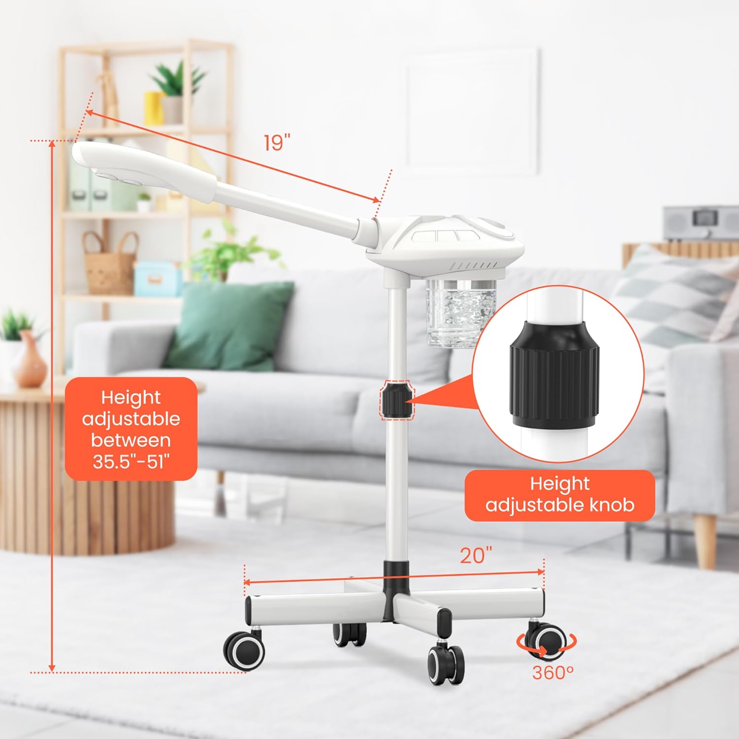 • Adjustable Height: The steamer's height can be adjusted as needed, and the nozzle can rotate to meet different angle requirements. Whether sitting or lying down, you can find the most comfortable angle for a comprehensive facial care experience and enjoy the steamer spa.