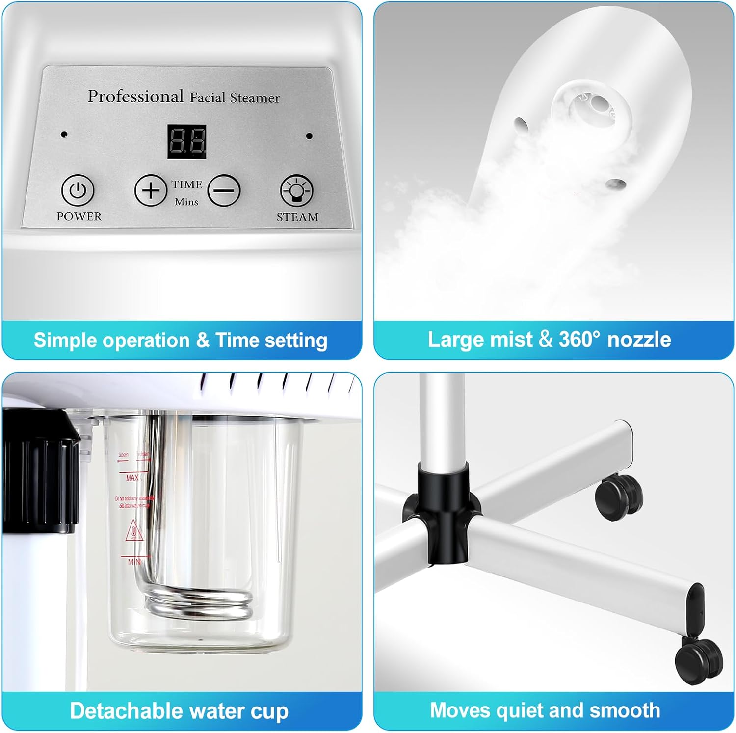 - 【Facial Steamer for Esthetician】Facial steamer is easy to operate, excellent materials, high heat resistant and no rust, New upgraded nozzle, essential oil sticks, perfect for beauty salon, spa, and at home.