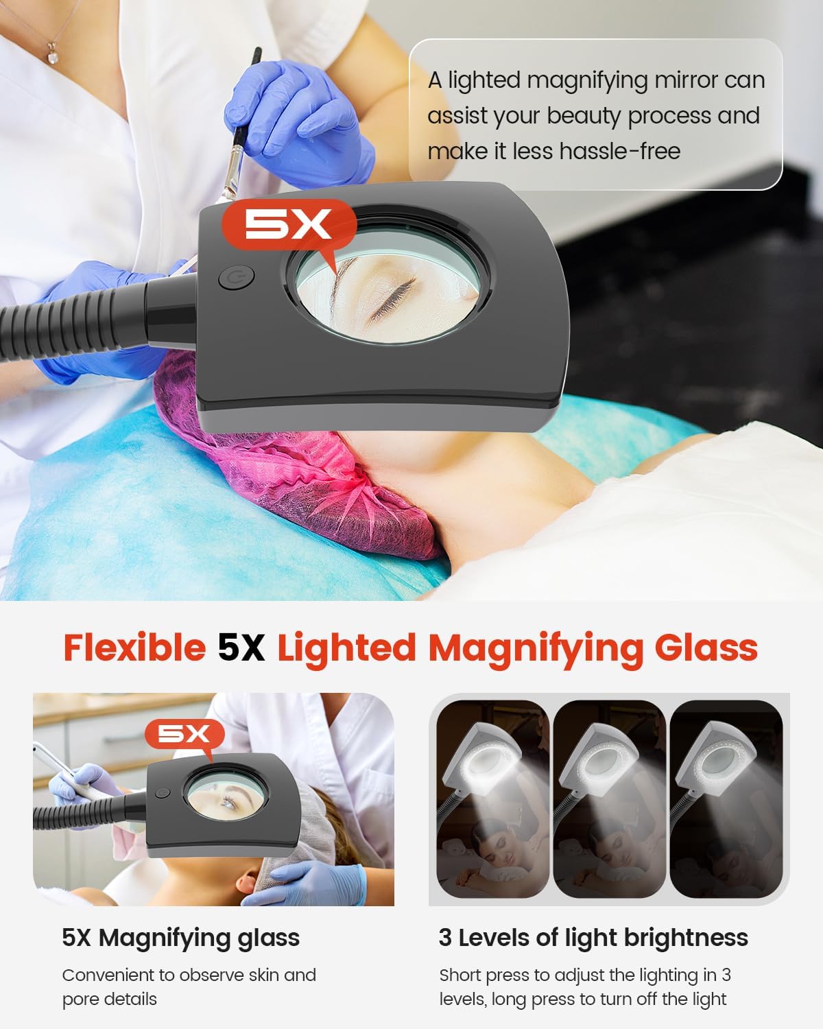 - š¬ 5X Magnification + Pro-Grade LED Illumination. See every detail! Built-in 5X ultra-clear magnifying lens combined with 3-level adjustable LED light provides unparalleled clarity. The 8500K true daylight color temperature minimizes eye strain and reveals genuine skin tone. Easily identify blackheads, blemishes, and imperfections, ensuring targeted, effective treatments for a flawless complexion.