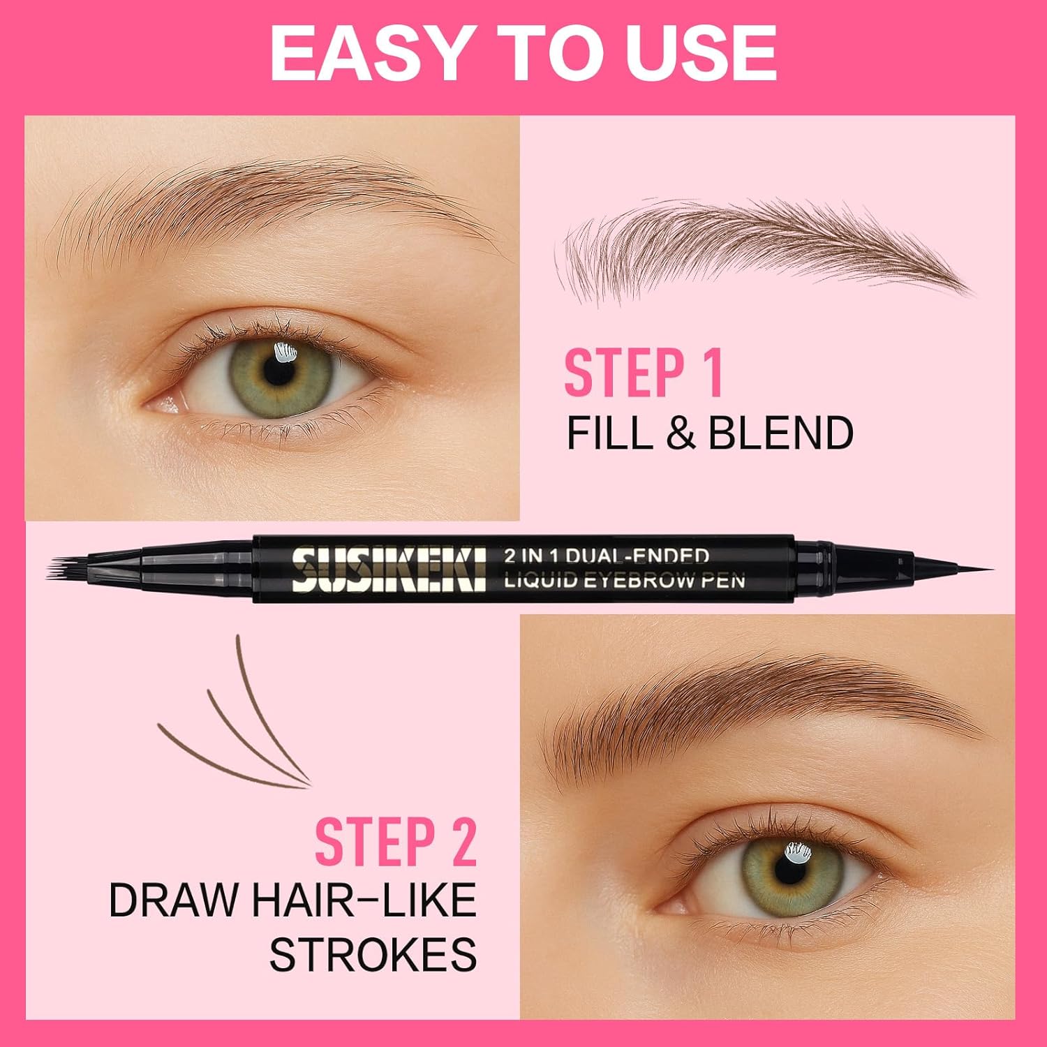 • 2 IN 1 BROW PEN -This innovative liquid eyebrow pen features a dual-ended design that combines two pro-grade applicators in one sleek tool. One end is equipped with a brow-fection square angled brush, perfect for creating natural-looking hair strokes and filling in sparse areas. The other end features a super-fine detail brush tip for defining edges, shaping arches, and adding micro-precision details—giving you total control over your brow style, from natural to bold.