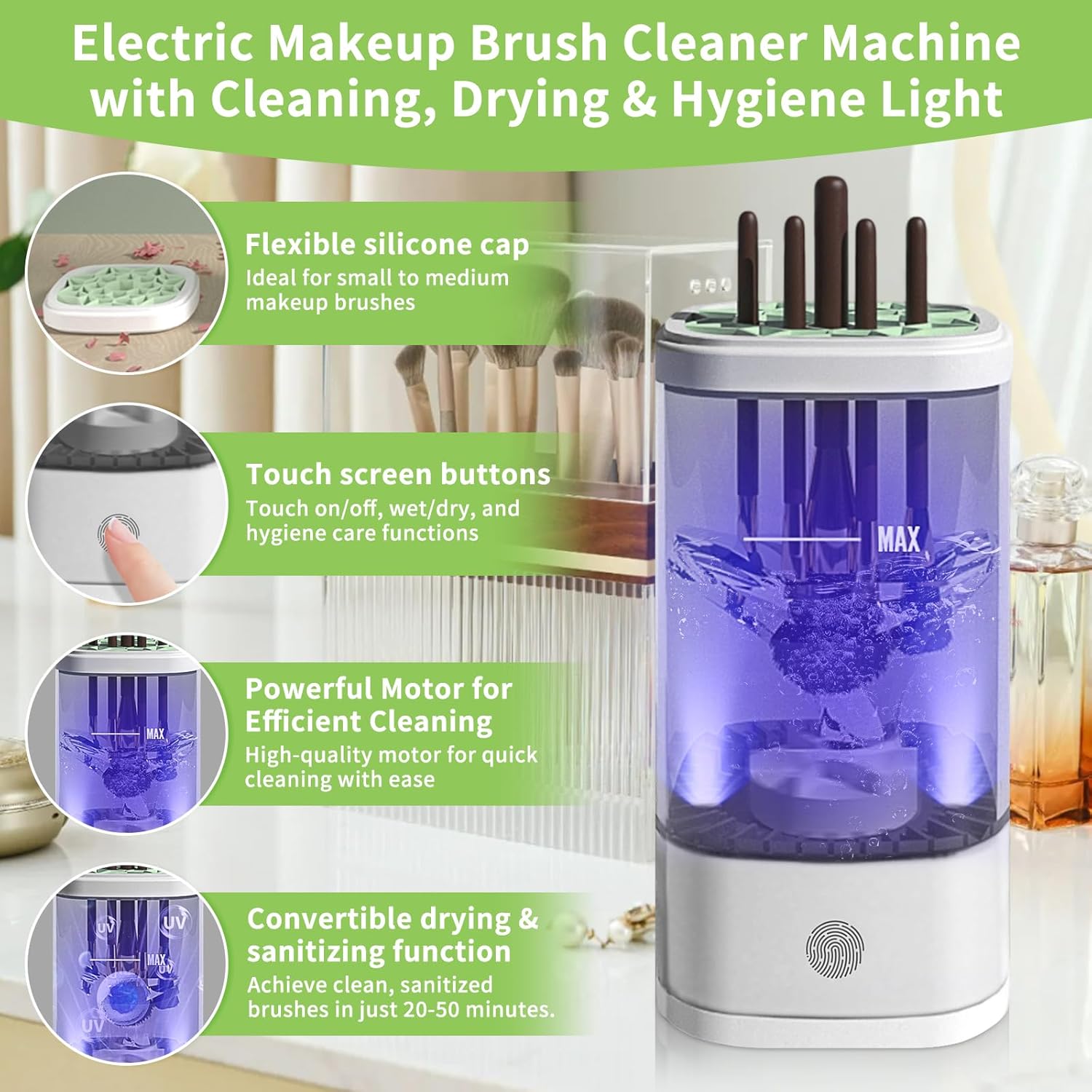 - 【 Deep Cleaning Power 】This Electric Makeup Brush Cleaner is powered by a high-speed 9000 RPM motor that delivers deep, thorough cleansing within seconds. Designed to effortlessly remove foundation, powders, oils, and built-up product, the motor spins at high velocity to agitate bristles and dislodge every bit of residue, giving your brushes a fresh, brand-new feel. It's a fast, hygienic, and mess-free solution for every beauty routine.