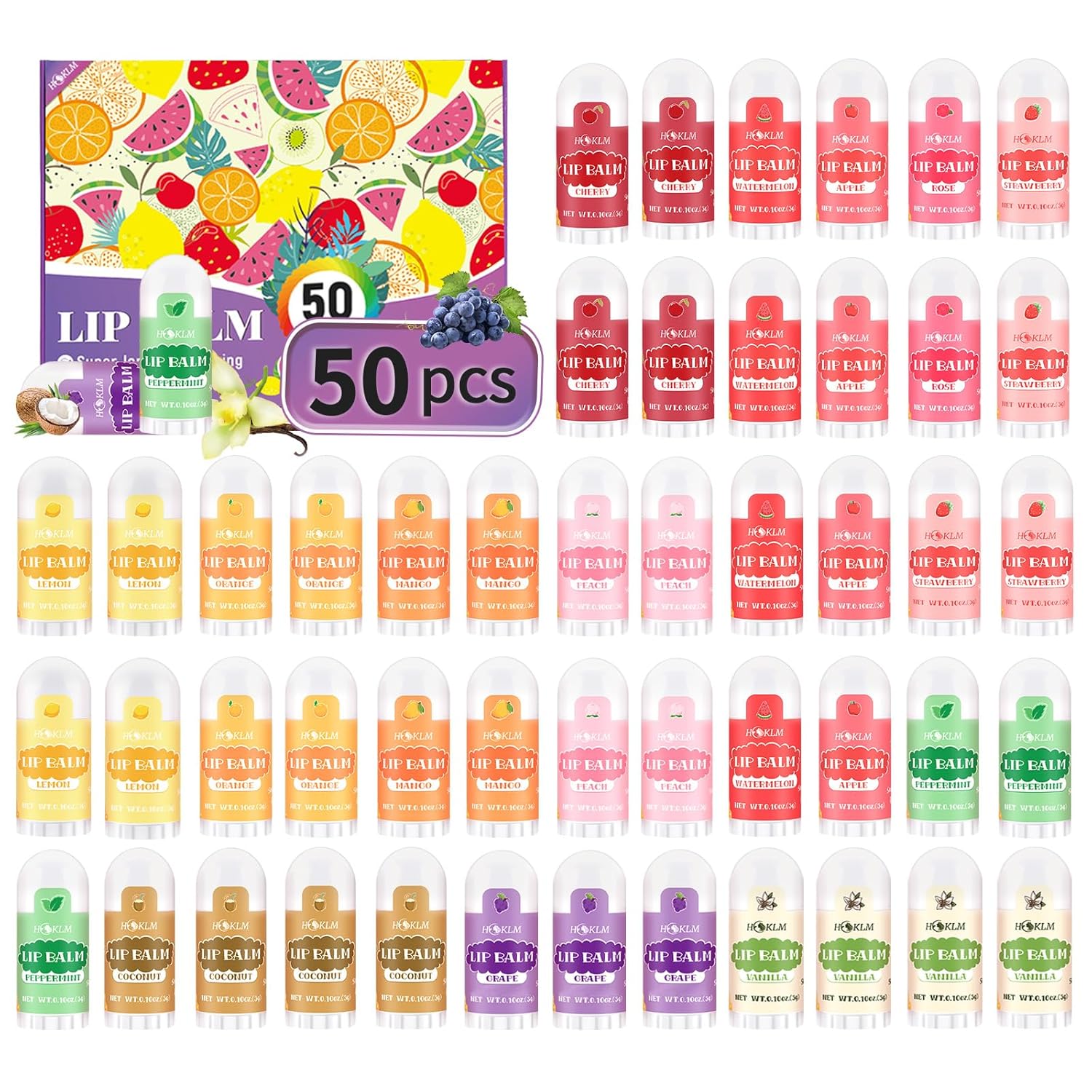 - Flavor Variety: 50-pack mini lip balm set features 13 popular flavors including apple, cherry, vanilla, lemon, strawberry, peach, orange, mango, coconut, mint, watermelon, grape, and rose.