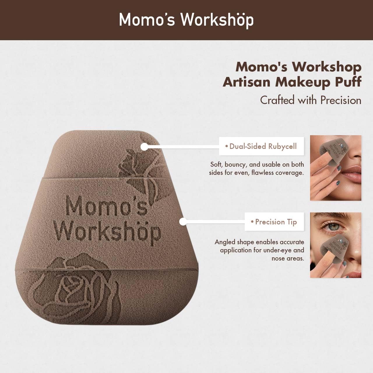 - ăPremium Dual-Texture DesignăFeatures 1.8mm dual-sided Rubycell foam with 3mm Rubycell strap and inner polyurethane sponge. The fine, dense texture ensures soft, fluffy application with excellent powder distribution.