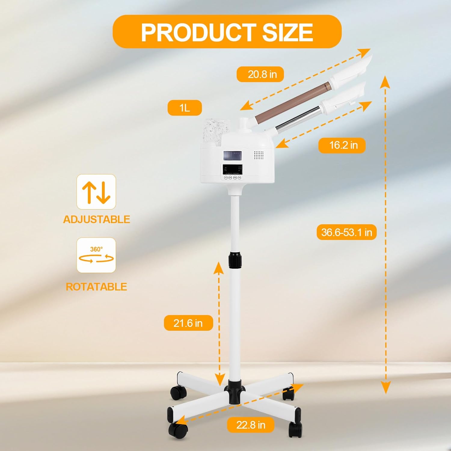 • 【Height Adjustable】This professional facial steamer has an adjustable height of 36.6-53.1 inches. 360° rotatable nozzle, 360° rotatable main body for lying down or sitting down to enjoy your facial spa, and the best steaming time is 15-20 minutes.